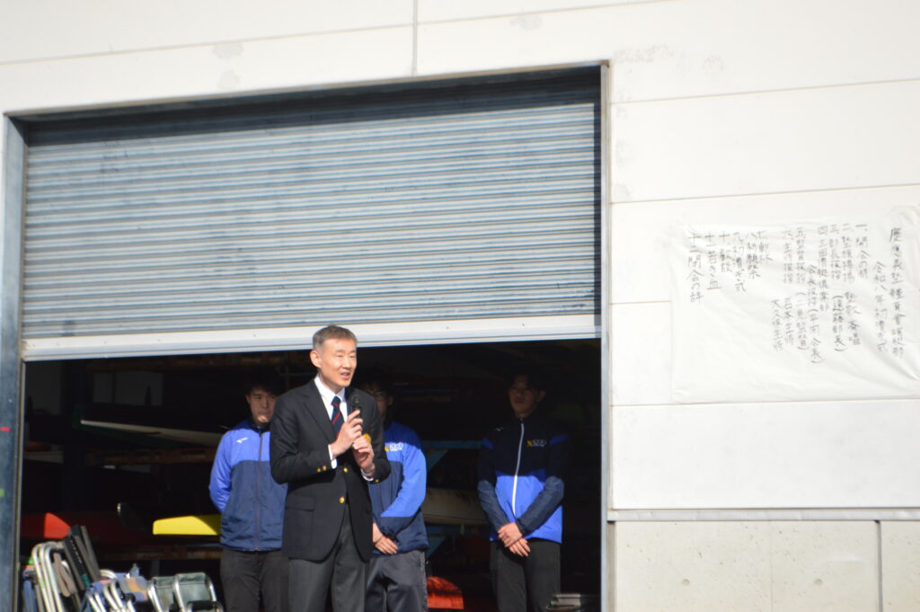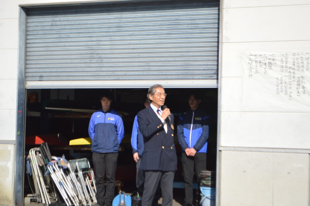 塾旗掲揚と塾歌斉唱に続き、遠藤部長および平岡三田漕艇倶楽部会長より、現役部員へ向けた力強い激励のお言葉を頂戴いたしました。